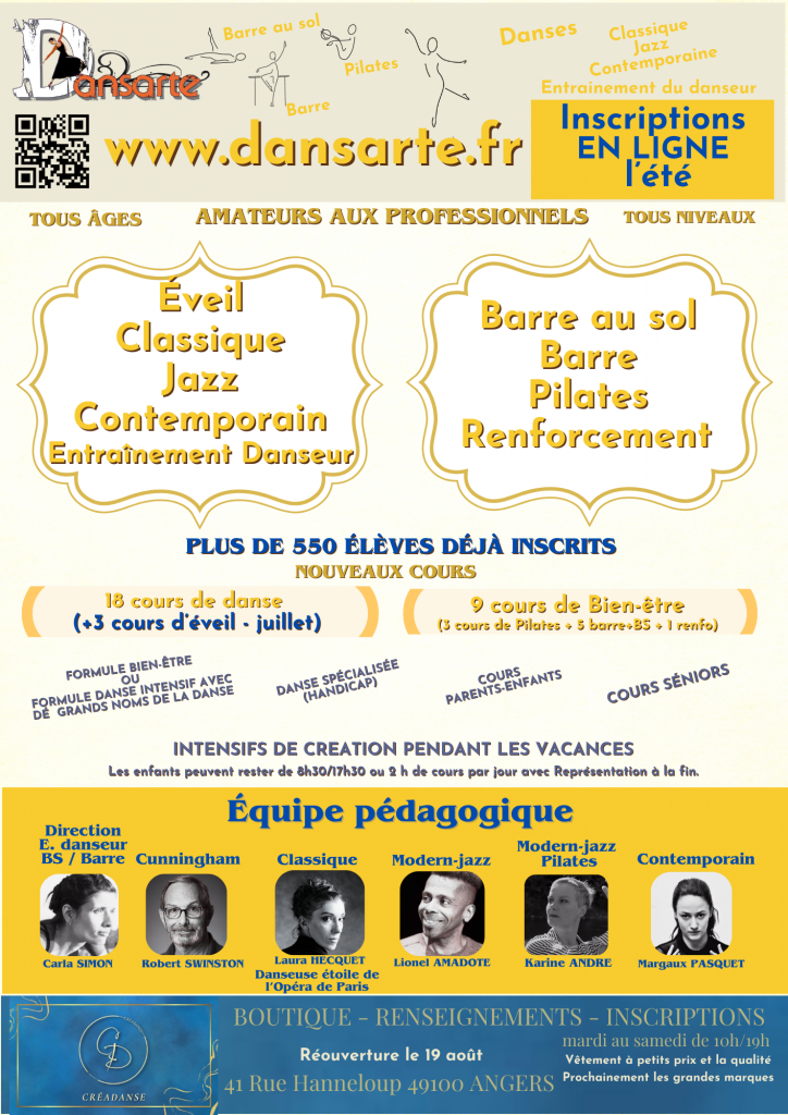 ⚠ Dernières places disponibles, mais si le cours de votre choix est complet envoyer un mail à dansarte49@gmail.com, pour vous mettre en liste d’attente. Beaucoup des changements les deux premières semaines de cours.